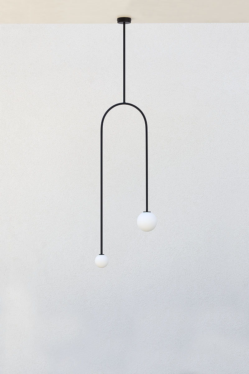 Dwie mleczne kule o różnej średnicy zawieszone na różnej wysokości – bardzo ładne połączenie. Specjalnie dobrane źródła światła świecą tą samą mocą. Lampa ma długość 146 cm mierzone od sufitu.