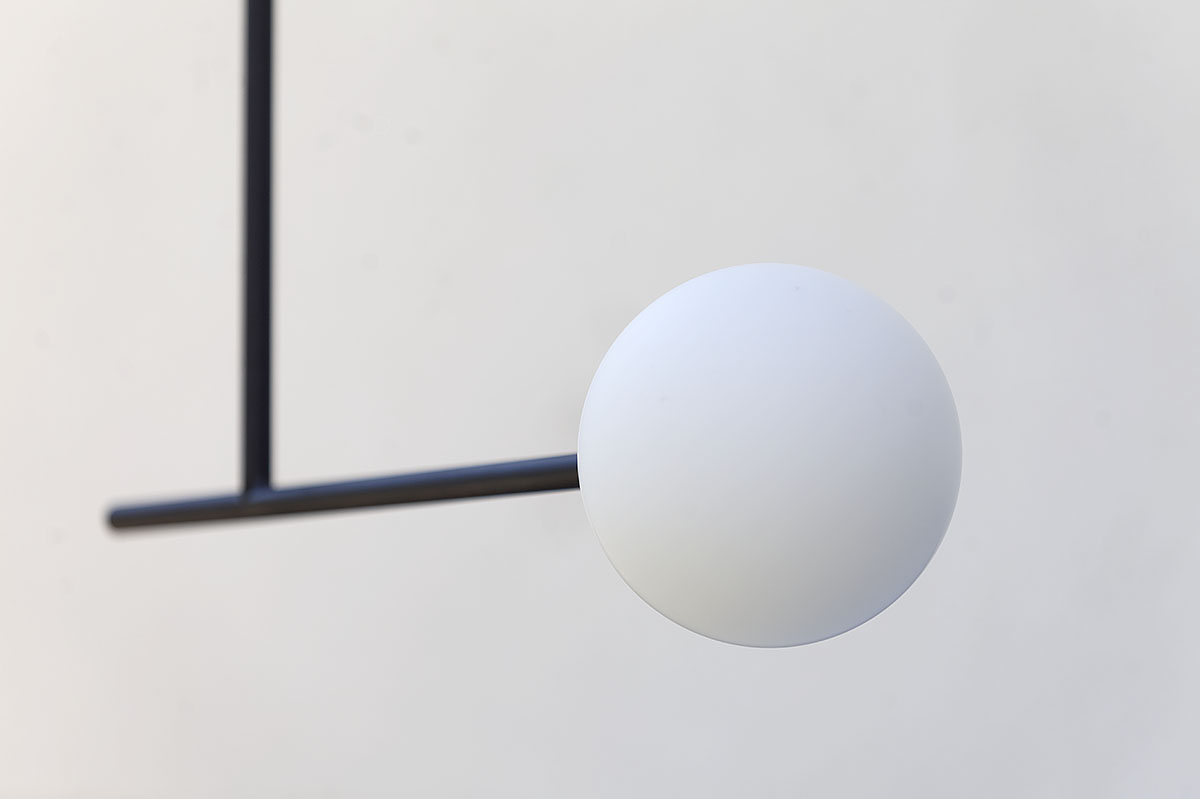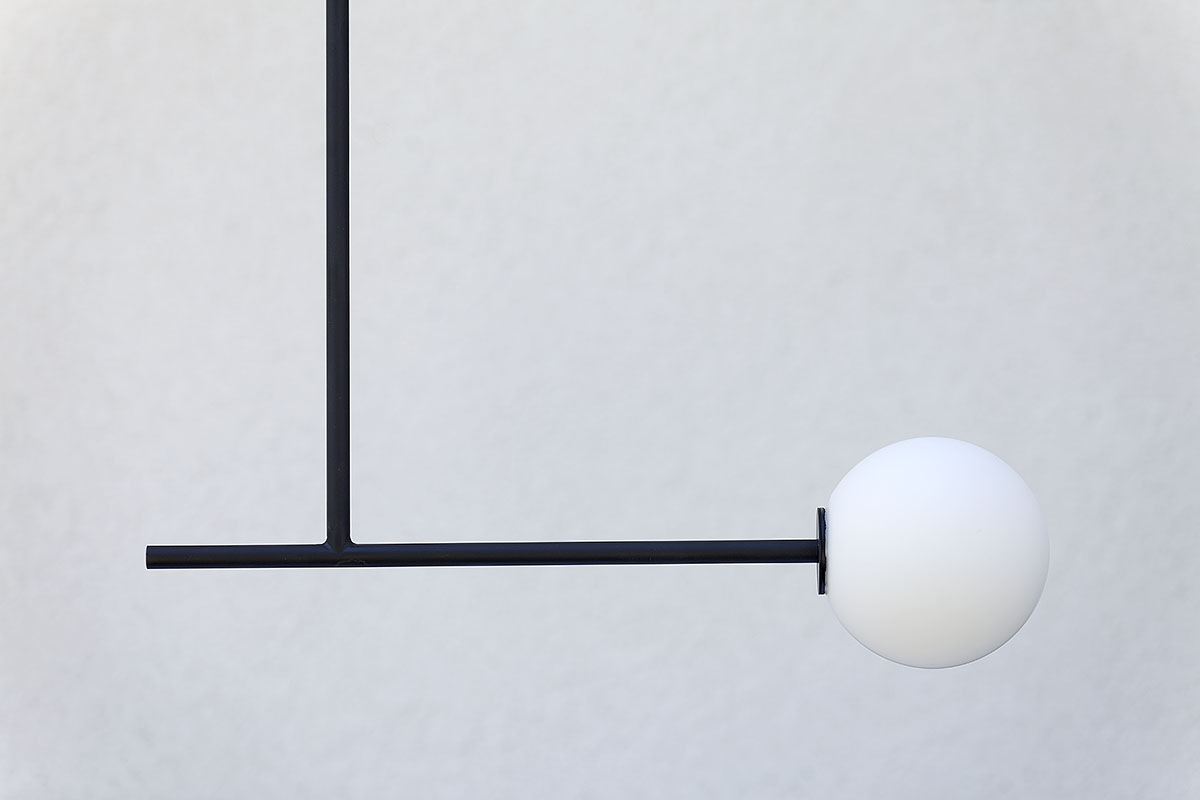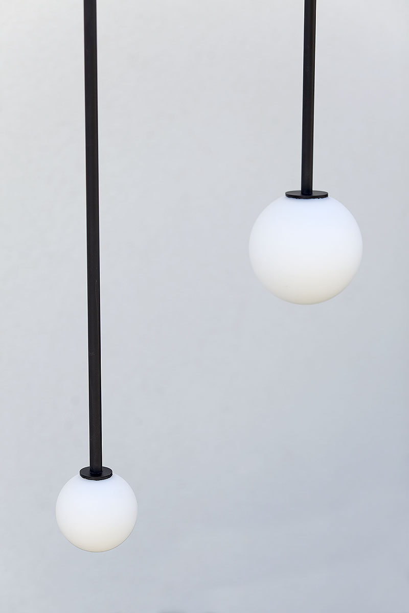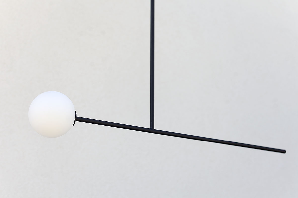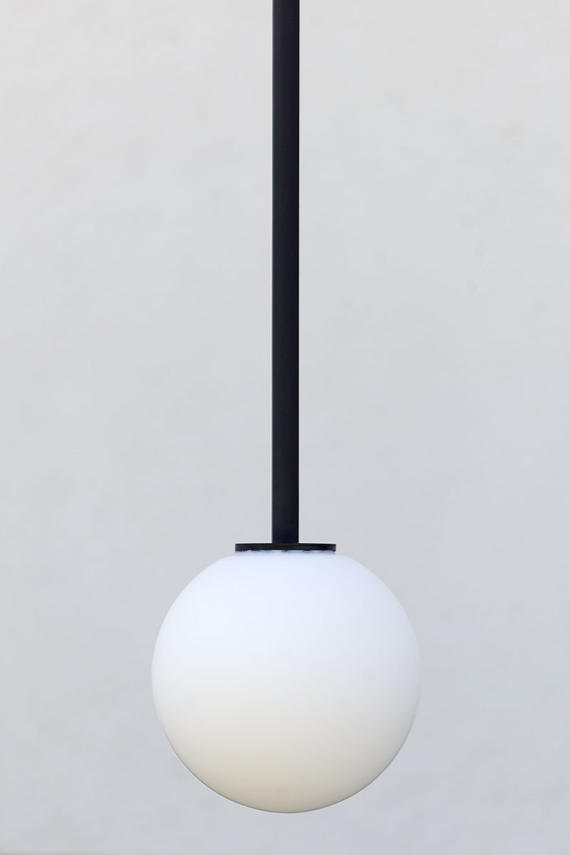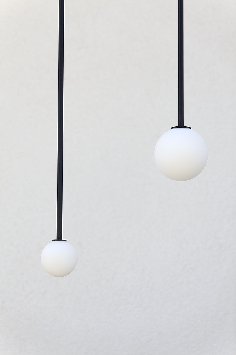 Lampa do pokoju ma nieco mniejsze rozmiary. Szklana kula ma średnicę 14 cm, podobnie jak poprzednie lampy do sypialni, natomiast jej długość to tylko 115 cm. Podobnie jak inne cechuje się dbałością o wykończenie detali. We wszystkich lampach zależało nam na estetyce, na czystej formie, na ładnym połączeniu kuli z elementem konstrukcyjnym.